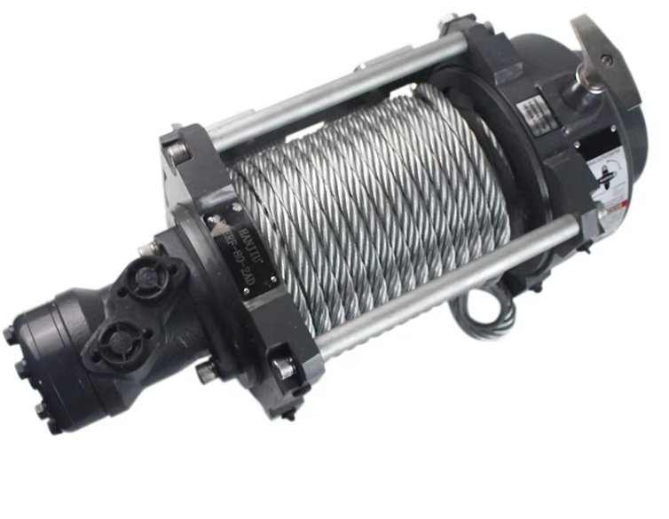 Hydraulic winch is mainly composed of hydraulic motor (low speed or high speed motor), brake, gear box, drum, support shaft, frame, rope device (optional), etc.
